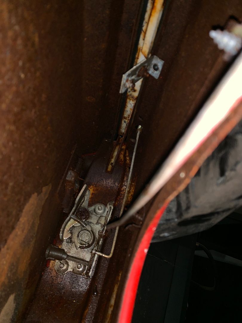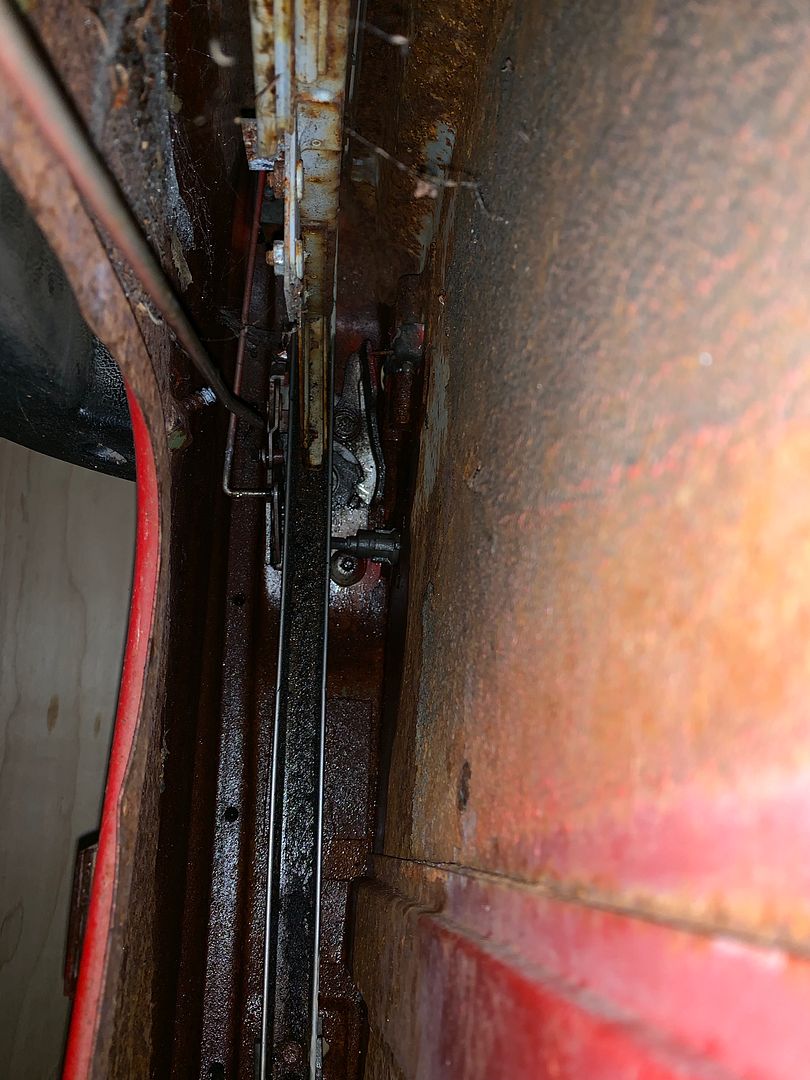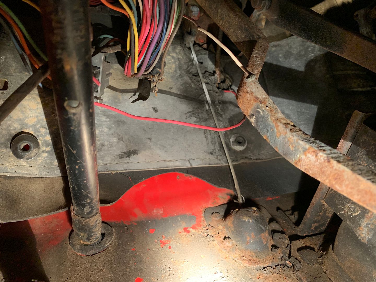 I sat in it and stepped on the clutch pedal and brake pedal. The seem kind of loose but not sure how they are supposed to actually be. Anyway, I looked up under them to see if I could see anything that would make them loose and that is when I spotted this. I have never seen a clutch cable go down through the floor like that. Interesting. LOL